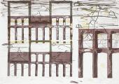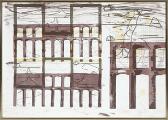 Murstensskulpturer. Signeret med dedikation, 24–11-94. Litografi i farver. Lysmål 87×123 cm.