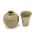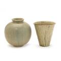 To vaser af stentøj modelleret i hhv. kugleform og oval form. Dekoreret med hhv. gråblå og gråbrun glasur. Sign. monogram hhv. 12 og 40. H. 12,3 og 10,3. Oval vase: L. 10,2. Kugleformet vase: diam. 11,5. (2)