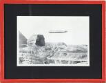 Original black-and-white press photograph of the German airship LZ 127 Graf Zeppelin passing over the Great Sphinx and the pyramids at Giza, Egypt, in the spring of 1931. Back with restriction stamp, archive stamp, handwritten notes, remnants of glued-on news telegram or note, and stamped date of newspaper publication (May 23, 1931). Red-painted wooden frame with double glazing. Visible size 16×22 cm. Frame size 25×32 cm.