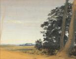 Yellow fields with trees and tree trunks. Unsigned. Inscribed on the stretcher. Oil on paper laid on canvas. 19.5×23.5 cm.