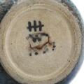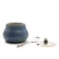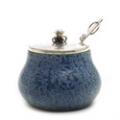 A stoneware marmelade jar, decorated with blue glaze with dark blue elements. Signed monogram 1937. Fitted with sterling silver lid and spoon. marked Hans Hansen, anno 1937. H. 9 cm.