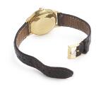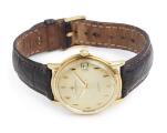 Wristwatch of 18k gold, ref. 6394Q. Mechanical movement with automatic winding and date, cal. K1072. 1960s. Leather strap with period-correct Andre Wenger buckle of 18k gold. Diameter 36 mm.