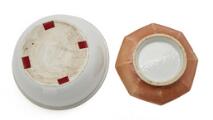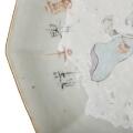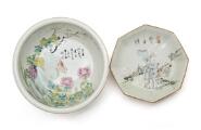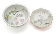 A Chinese enamelled porcelain bowl painted with a bird and calligraphy Diam. 22.5 cm and a stem dish of octogonal form with a scholar Diam. 18.5 cm. Late Qing-Republic. (2)