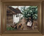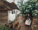En kone sidder og strikker under nyudsprungne hyld ved et stråtækt hus. Sign. H. A. B. Olie på lærred. 48×60.