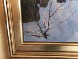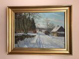 Snedækket vinterlandskab med hus ved landevej i Lillerød. Sign. Harald Pryn. Olie på lærred. 50×70. Rammemål 64×84.