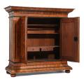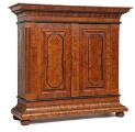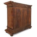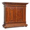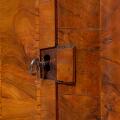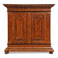 A large Baroque walnut wardrobe called 'Wellenschrank', profiled top an base, the front with a pair of panelled doors with a hidden keyholde enclosing a large iron lock. Zürich or Frankfurt. C. 1720. H. 220 cm. W. 220 cm. D. 81 cm.