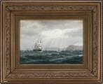 Solen bryder gennem skydækket over et dansk sejlskib. Sign. Carl Baagøe 91. Olie på lærred. 24×33,5 cm.