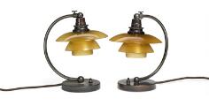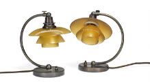 “PH-1/1” “Natbordslampe”. Et par små drejelige bordlamper med stel af patineret bruneret messing. Fatningshus af bakelit. Skærmholdere mærket “Patented” og “PH-1”. Skærme af ravfarvet glas. Udført 1930'erne hos Louis Poulsen. H. 23. (2)