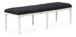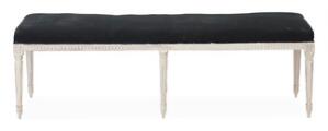Svensk bænk af bemalet træ, sæde monteret med sort stout. Gustaviansk form 20. årh. H. 45 L. 150 B. 50.