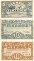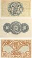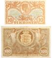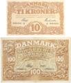 Danmark, 100 kr 1930, nr. 0906653, Lange /Jessen, Sieg 110, 10 kr 1928 Q, nr. 9364524, Lange / Lund, Sieg 103, samt 5 kr 1942 J, 10 kr 1942 R, 1947 e, Sieg 102, 105, 122, i alt 5 stk.