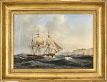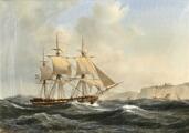 Sejlskib ud for de hvide klipper ved Dover. Sign. A. Melbye 1846. Olie på lærred. 33×48.