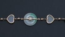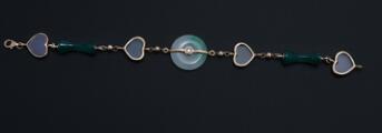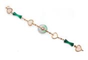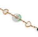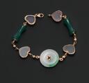 Jade-, kvarts- og agatarmbånd af 18 kt. rosaguld prydet med poleret skive af jade, grønne agater og polerede kvarts i form af hjerter. L. ca. 17,5 cm.