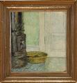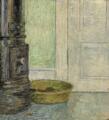Interior with tiled stove and a dog's basket. Signed monogram 05. Oil on cardboard. 39 × 36 cm.