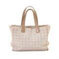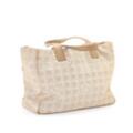Taske af beige stof med to læder hanke, et stort åbent rum med to indvendige lynlås lommer og beige inderfor af stof. H 25 x B 35 x D 15 cm.