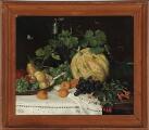 Still life with a melon, flowers a fruit dish with swarming insects. Indistinct signature M.? Oil on canvas. 45×52.5 cm.
