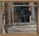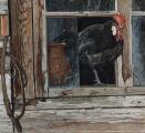 A rooster in a window in an old wooden building. 1928. Signed K. Vyssotsky (in Cyrilic). Oil on canvas. 67×73 cm.