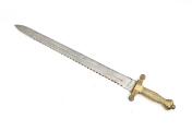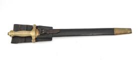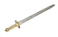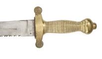 A Swiss pattern 1842 pioneers saw backed hanger in its scabbard with frog. The c 51 cm long solid saw backed blade is marked WAFFENFABRIK NEUHAUSEN and the frog is marked JOH. VETTERLI STEIN?? on the back.