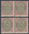 1875. 20 øre, grå/rød. Postfrisk, vandret adskilt “4-blok” (2 vandrette parstykker). AFA: 10800+. Attest Nielsen [ 28 ] [ ** ]