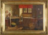 Interior from a kitchen. Indicated on the backside Harald Schiødte. Oil on canvas. 49×71.