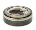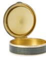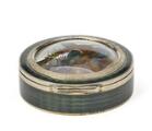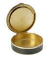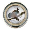 Rund tabatiere af forgyldt sterlingsølv, prydet med grøn translucid emalje på guillocheret grund, hængslet låg prydet med “reversed intaglio” i form af tjurhane, på perlemor. Gebrüder Nathan, Hoflieferanten, Berlin ca. 1910. Vægt 130 g. H. 2,3 cm. Diam. 6,3 cm.