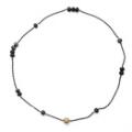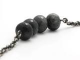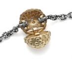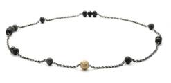 A diamond clasp set with numerous brilliant-cut diamonds, mounted in 14k gold. Accompanied by a necklace of oxidised silver set with numerous faceted moonstone beads. Weight app. 49.5 g. Clasp diam. 14 mm. L. 80 cm. (2)