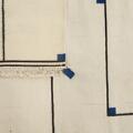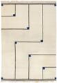 “Vertigo”. Handwoven wool carpet in “rölakan” flatweave technique. Geometric pattern in black and blue on white ground. Made by Linie Design. L. 238 cm. W. 170 cm.