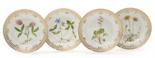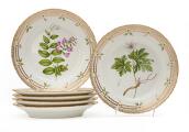 “Perlestellet” seks frokosttallerkener af porcelæn, dekoreret i farver og guld med blomster i Flora Danica manér. Royal Copenhagen. Diam. 22,5 cm. (6)