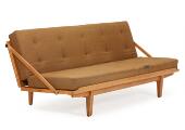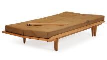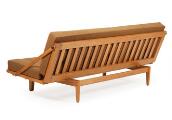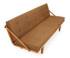 Daybed with oak frame, beech spokes in back, adjustable pull-down back with two oak sticks. Two-parted epeda cushion/mattress upholstered with button-fitted brown wool. Model 200. Manufactured by Frem Røjle. 1950–60's. L. 200 cm.