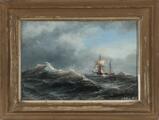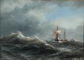 Seascape with a sailling ship at high sea. Signed and dated A. melbye 1845. Oul on panel. 12×17 cm.