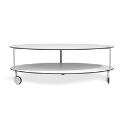 “Giro”. Sofabord med top af hvid laminat, tre-benet stel på hjul. Fremstillet hos Zanotta. H. 36,5 Diam. 110.
