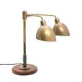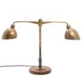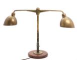 Dobbelt pultlampe af patineret messing med svingbare arme, to gennemgående afbrydere, monteret på base af mahogni. Dette eksemplar udført 1930–1940'erne hos Louis Poulsen. H. 66. B. 97 cm.
