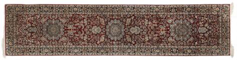 Orientalsk løber i Isfahan kvalitet. Design med 3 medaljoner. Flot kvalitet, partier med silkeluv. Ca. 800.00 kn. pr. m2. Kvyttet på silkekæde. 21. årh. 370×85.