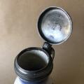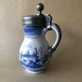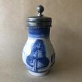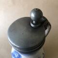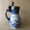 Delft lågkrus af fajance, dekoreret i blåt, montering af tin. Tre stempler og årstal. Holland, ca. 1700. H. 15,5. Diam. 8 Rummål: 1 pægl.