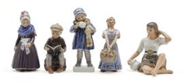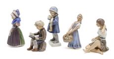 Five porcelain figures, decorated in underglaze colours. 1106, 1096, 1350, 1287 and 1165. Dahl-Jensen. H. 15–20 cm. (5)