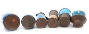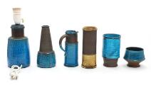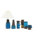 Seks dele chamotte, bestående af fire vaser, en bordlampe og en kande, dekoreret med hhv. blå og okkergul glasur med reliefdekor. Sign. HAK, delvist sign. Nils. Udført hos Kähler. H. 9–20. (6)