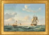 Sejlskibet “Johanna” og andre fartøjer i Sundet ud for Kronborg. Sign. Anton Melbye 1849. Olie på lærred. 83 × 122.