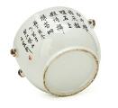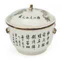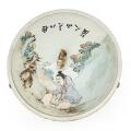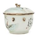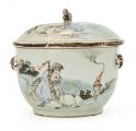 Kinesisk madskål af porcelæn, dekoreret i farver med figursceneri og kalligrafi. modelleret med hanke. Sen Qing ca. 1900. H. 13 cm Diam. 14 cm.