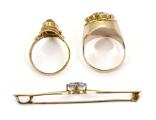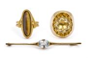A citrine ring, an aquamarine brooch and a tiger's eye ring set with respectively a circular-cut citrine and faceted aquamarine and polished tiger's eye, mounted in respectively 14 and 17 gold. Weight in total app. 16 g. Ring size 54 and 52. Brooch L. 5.5 cm. (3)
