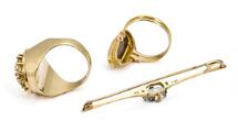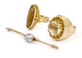 The tiger's eye ring has indistinct hallmarks, but is testing 17k.