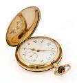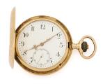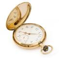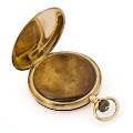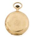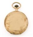 Dobbeltkapslet lommeur af 14k guld. Mekanisk værk med ankergang og kroneoptræk. Hvid emaljeskive med gyldne visere. Støvkapsel af forgyldt metal. Ø 53 mm. Uret vejer cirka 104,8 gram. 1900–10’erne.
