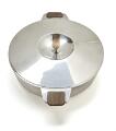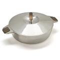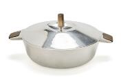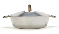 A sterling silver dish and cover. Smooth surface and wooden handles and finial. Marked Bunde, Sterling Denmark. Made and marked by Cohr. Weight 773 g. H. 10 cm. Diam. 17.8 cm. L. 23.4 cm.