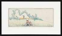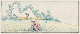 Surrealistic composition. The man with the scythe and the little girl. Signed v.b.p.-40. Coloured crayon on paper. Visible size 14×33 cm.