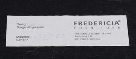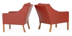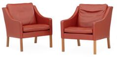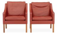 Et par lænestole med ben af kirsebærtræ. Sæde, sider og ryg betrukket med rødt skind. Model 2207. Formgivet 1963. Udført og mærket hos Fredericia Furniture. (2)