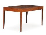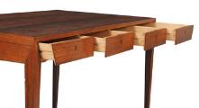 Fritstående skrivebord af palisander, opsat på tilspidsende ben, front med fire skuffer i sarg. Model 36. Udført og mærket med label hos Haslev Møbelsnedkeri. 1960'erne. H. 73. L. 143. B. 75 cm.