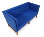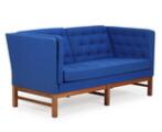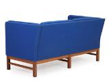 Fritstående to-personers sofa med stel af mahogni, ryg, sider og løse hynder betrukket med blåt uld. Model EJ 315. Udført og mærket hos Erik Jørgensen. L. 153 cm.