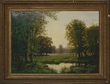 Skovparti med stork ved sø, formodentlig fra Vallø. Sign. monogram EREilersen 1882. Olie på lærred. 98×137