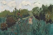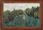 Pige i bærbuske. Signeret Einar. Olie på lærred. 40×60 cm.