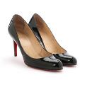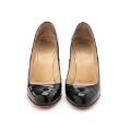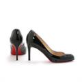 Et par stiletter af sort lak med rund snude, smal hæl, beige læder inden i og klassiske røde såler. Str. 38 ½. Hæl højde ca. 9 cm.
