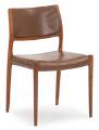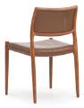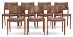 Sæt på syv spisestole af teak. Sæde og ryg betrukket med brunt, farvet skind. Model 80. Formgivet 1968. Udført og mærket hos J.L. Møbelfabrik, Højbjerg. (7)