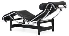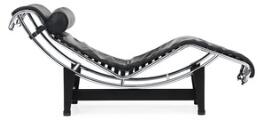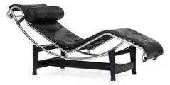 “LC4”. Chaise longue with black lacquered steel frame, top with chromed steel frame. Loose cushion in seat and back and neckrest upholstered with black leather. Designed 1928. Manufactured and stamped by Cassina, Italy.